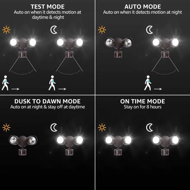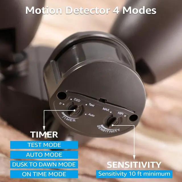 Auto Mode (for nighttime operation): Auto-on when motion is detected and auto-off after 10 seconds to 5 minutes (adjustable) when no further motion has been detected.