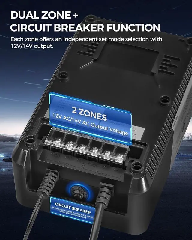 Dual-Zone Independent Control, Personalized Lighting: This transformer features 2 independently controlled output zones. By pressing the "Zone 1" or "Zone 2" button, you can easily set the mode for each zone separately. To ensure safe and stable operation, the total power of both zones should not exceed 80% of the transformer's rated power