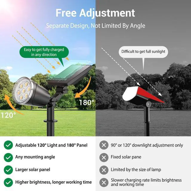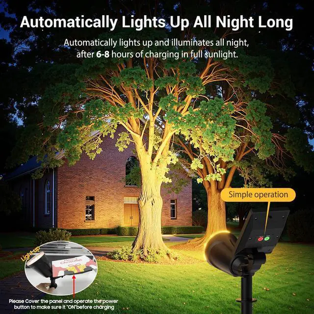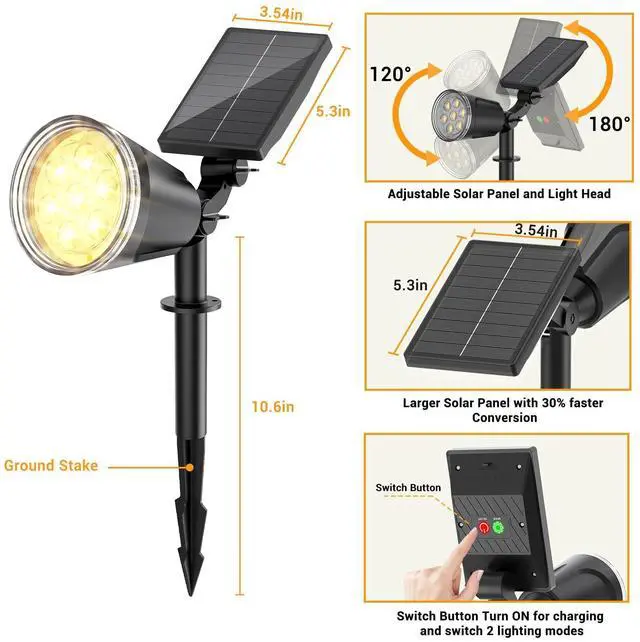 2 LIGHT MODE: Make sure solar spotlight turn ON before Charging, via clicking the power button. You can cover the panel or turn the panel upside down to check it. Big outdoor solar spotlights waterproof built-in light sensor auto turn on at dusk and off at dawn, ensuring hassle-free operation. Solar landscape spotlights auto switch charging to lighting. 2 Lighting Options: Medium and High, making freely design the pose of led spotlight solar for yard, garden, pathway, driveway, tree, mailbox