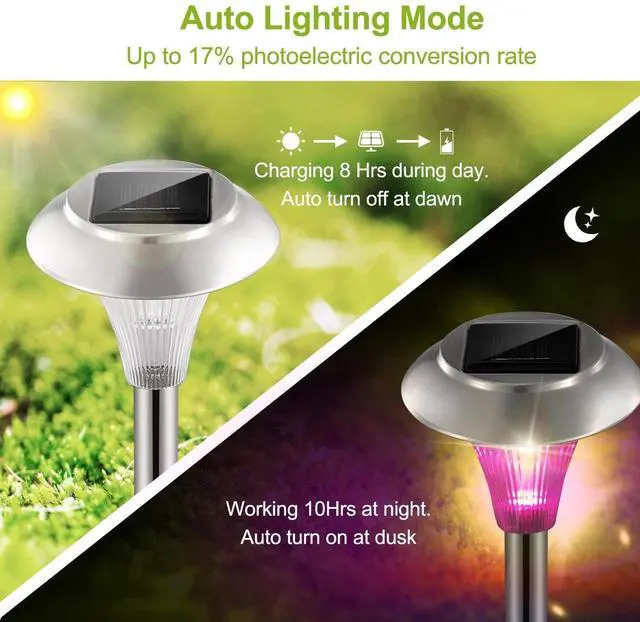 - *DURABLE MATERIALS & COLOR CHANGING LIGHTS:Adopts stainless steel and PC plastic materials,durable,anti-oxidation and free from color fading. 2LED bulbs per light changes color slowly,which displays colorful lights and decorates your garden.