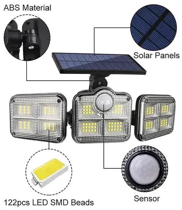 Solar Motion Sensor Light: Brighter than other flood lights outdoor, with motion-detection coverage of 270 degrees at a distance of up to 16.4 feet, and a powerful 2,400 mAh battery. Features 122 LEDs on the compact unit, with light panels on the front, sides, a solar panel on top, and it has an IP65 waterproof rating.