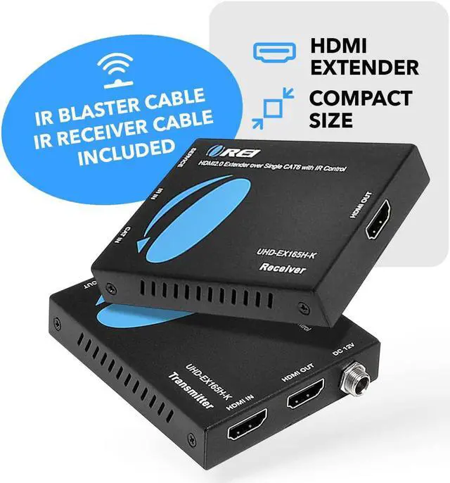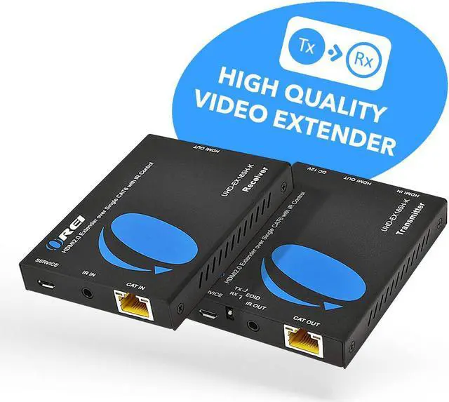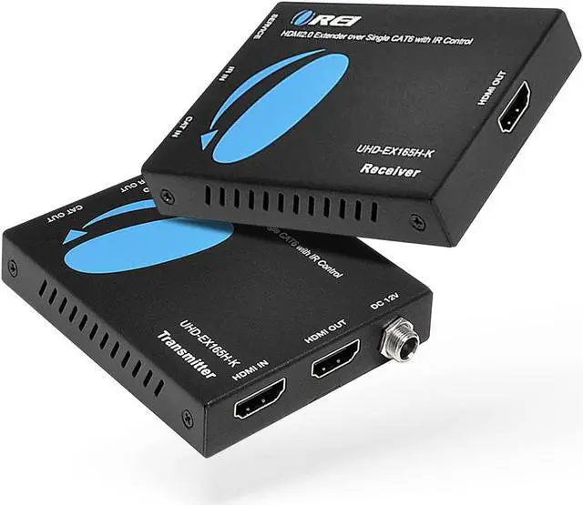 The Orei UHD-EX165H-K 4K HDMI extender box allows you to transmit up to 4K@60Hz video with HDR to distances up to 164 feet (50 meters) hdmi over Cat6 Ethernet cable. It supports transmission of lower video resolutions such as 1080p@60Hz with high-definition multi-channel audio. This kit is enabled with power over cable (POC) feature so you just need to connect the power adapter to the sender (transmitter unit) and the receiver unit will receive the power via the Ethernet Cable. It also supports one-way IR control from the receiver side to send the remote IR commands to the source near the transmitter. EDID management lets you copy the EDID signal from the transmitter's loop-out display or the receiver's display.