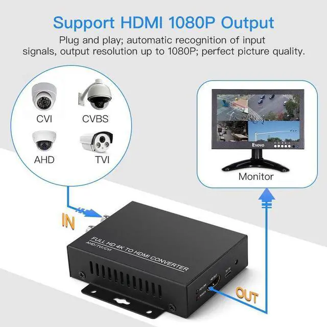CVI/TVI/AHD+CVBS to HDMI. HDMI output 1080P/60FPS. Connected to HDMI output, HD-LINK indicator is always on, yellow light. Plug and play; automatic recognition of input signals.