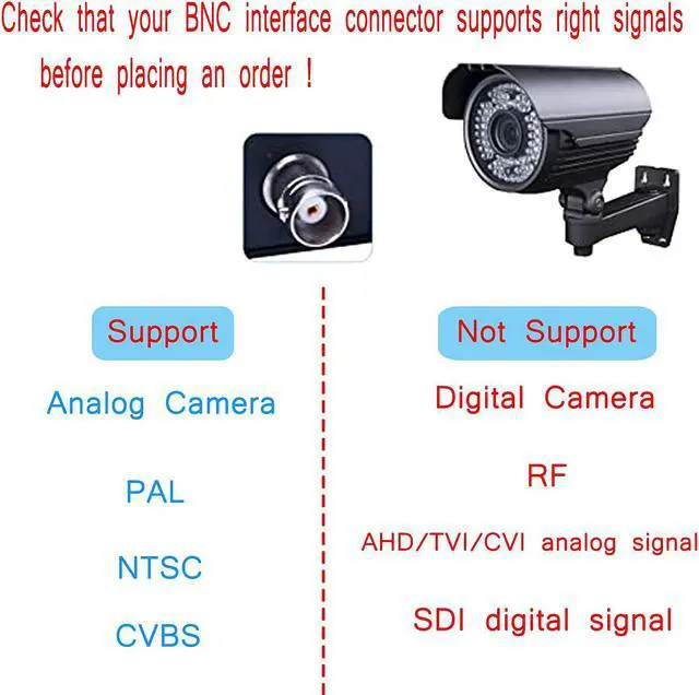 (Note:BNC connector is different from cable TV's interface. It's not an SDI converter.And it cannot convert cable TV signal, ONLY FOR CVBS CAMERA. Before you purchase it, please check if your device is a CVBS analog camera. This adapter CAN NOT fit the digital camera or AHD/TVI/CVI camera.)