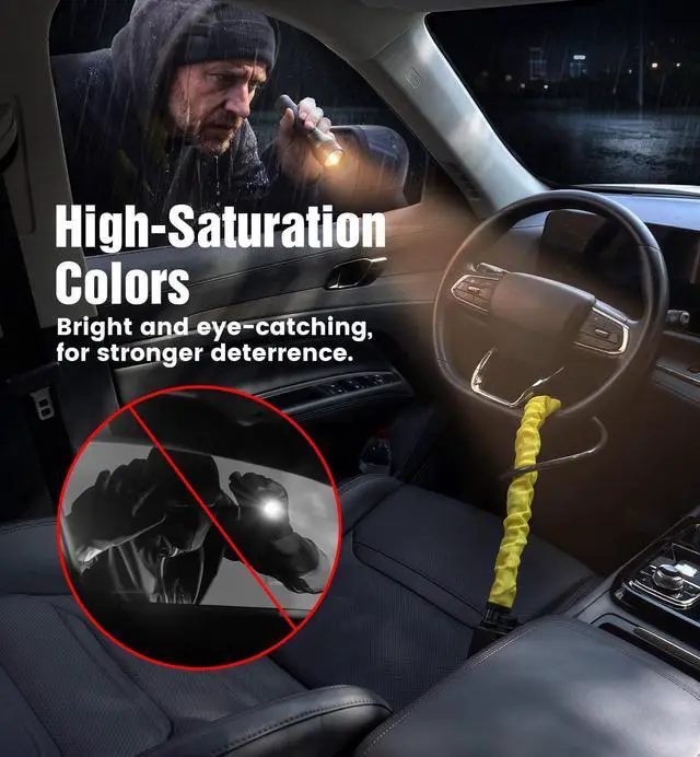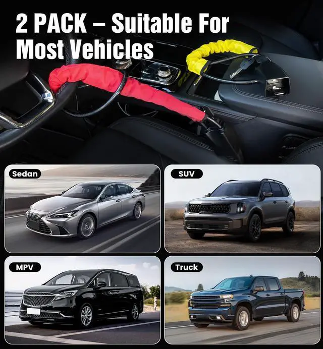 Highly Visible Dual LockingThis 2 pack car steering wheel lock can simultaneously lock the steering wheel and seatbelt buckle, effectively preventing unauthorized movement of the vehicle and providing extra security when parked. The car wheel lock are bright red and yellow respectively, the striking colors and clearly visible design create a strong deterrent, effectively warning potential thieves.