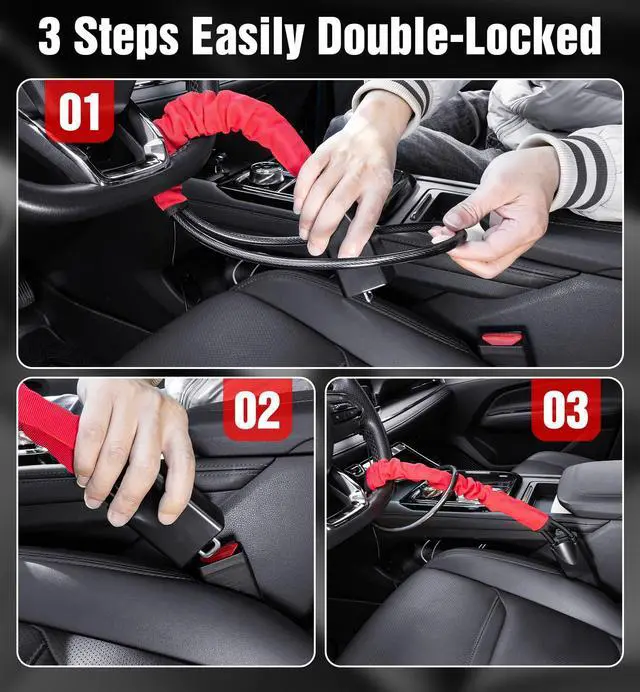 Safe and DurableThis anti theft car device is made with reinforced braided steel wire that is thicker than ordinary steel cables, effectively resisting cuts, pulls, and sawing. The outer premium PVC coating helps protect the steering wheel from scratches, reduces wear and tear during daily use, and provides rust and corrosion protectionmaking it one of the essential car necessities for long-term vehicle security and everyday driving.