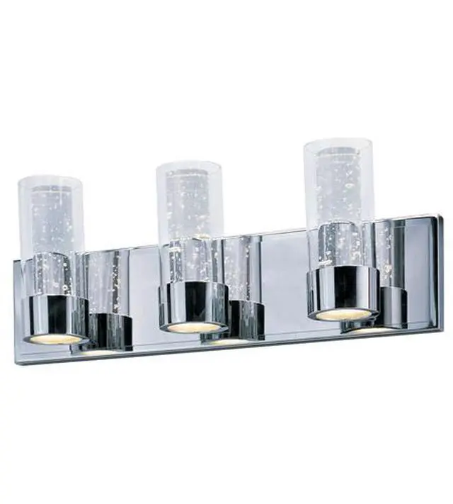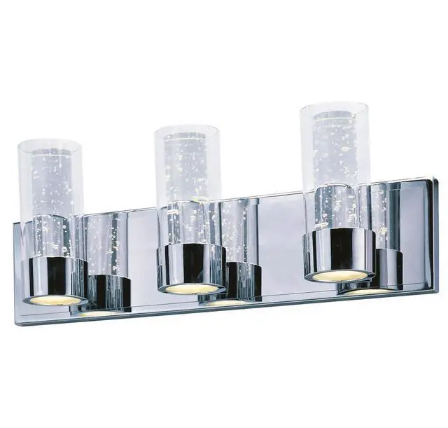 Rods of bubble glass are encased inside a Clear glass cylinder, which are supported in a cast Polished Chrome frame. Dual LED modules bring the bubble glass to life, while also providing ample illumination to the surface below.