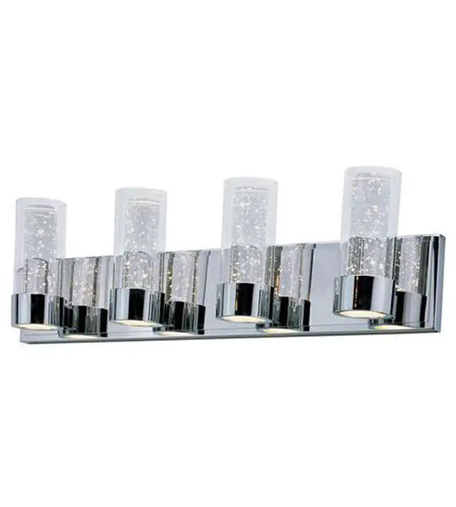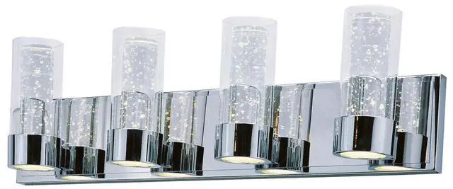 Rods of bubble glass are encased inside a Clear glass cylinder, which are supported in a cast Polished Chrome frame. Dual LED modules bring the bubble glass to life, while also providing ample illumination to the surface below.