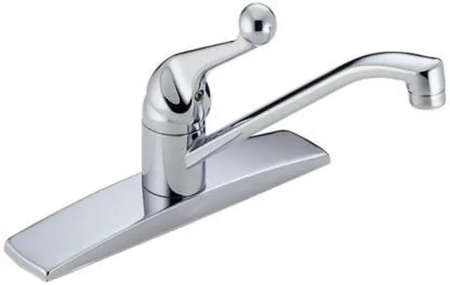Delta, 100, Classic Single Handle Kitchen Deck Sink Faucet, Chrome, The Classic kitchen offering provides a practical, hardworking solution that will stand the test of time, every time. Delta(R) is a reflection of your personality - as individual as you are. Delta faucets complement you, your style, your life, the way you think, work and move throughout the day. Bring your individuality to life. Delta's exclusive DIAMOND(TM) Seal Technology uses a valve with a tough diamond coating to bring you a faucet built to last up to five million uses. Plus, it keeps water inside the faucet out of contact with potential metal contaminants. Who knew a faucet could be just as beautiful on the inside? 8 in. long spout swings 360 degrees for added convenience, Single lever handle for easy operation, Solid brass construction with chrome finish ensures quality and reliability.