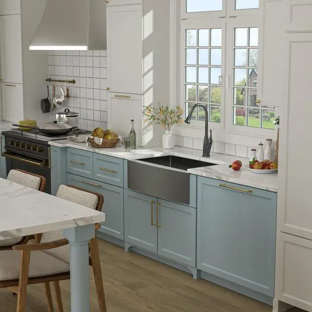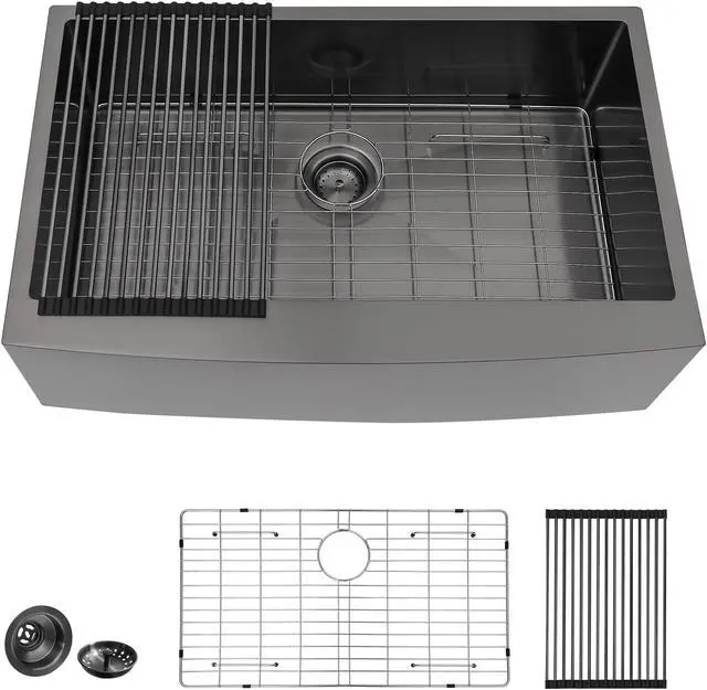 The 30 inch farmhouse kitchen sink is crafted from 16 guage stainless steel. Gunmetal black stainless steel sinks will not rust or stain. The 10-inch deep apron front sink lets you soak and clean large cookware and griddles. Apron front single bowl kitchen sinks have a larger farm design that minimizes slouching and eases the waist. Undermount farmhouse sinks are available with bottom grid and roller rack. This gunmetal black farmhouse sink will be a great helper in your kitchen work.