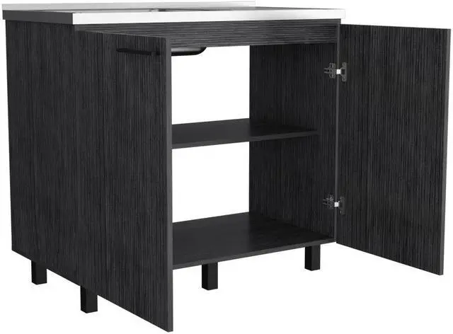 "The Burwood utility sink cabinet. This unit includes a sink and provides plenty of extra storage capacity, two doors and two shelves sizes ( 12.2"" H x 37.5"" W) to sort your kitchen accessories, making it ideal for any space. Designed with an elegant white, black or smoke oak manufactured wood finish.
