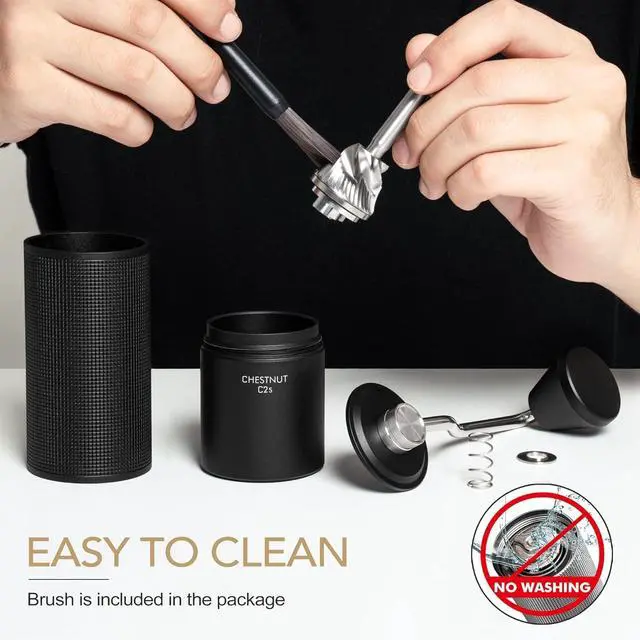 Keep Fresh Coffee Flavor Everday - Indulge your coffee desires professional coffee grinders are made of high quality materials. If you turn the hand crank clockwise, you can feel the beans being broken and ground, release the rounded and intense flavor of the coffee beans. Enjoy the wonderful grinding experience by hand only! Allow you to grind the right amount before brewing, ensuring you get the freshest and most delicious coffee everyday! Features: Adjustable Coarseness Settings Clockwise rotate get finer powder; Anti-Clockwise rotate get coarser powder. Convinent To Use with No Noise With no battery, no electric needed, the hand coffee grinder helps you enjoy quiet mornings without any noise. Easy To Clean & Simple To Carry Easy to disassemble for cleaning. With compact & portable size, perfect for camping, hiking or travelling. Specifications: Name: Chestnut C2S Coffee Grinder; Material: Aluminum Alloy, Stainless Steel, PC; Body Size: 5.79 Inch x 2.05 Inch; Handle Size: 6.26 Inch; Package Weight: 1.39 lbs; Max Capacity: About 25g Beans(according to beans type) Package Included: 1* C2S Manual Coffee Grinder; 1* Cleaning Brush; 1* Carry Bag, 1* User Manual. Warm Tips: 1.This equipment is only designed to grind roasted coffee beans, please do not grind other items; 2.It is recommended using a brush(package included) to clean the equipment, do not wash it with water; 3.The edge of the grinding core is relatively sharp, please pay attention to avoid scratches
