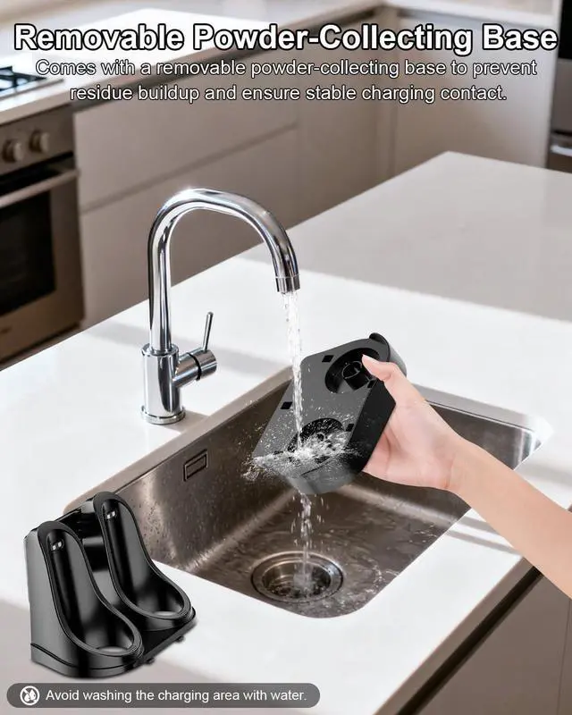 The included detachable base cleverly collects any residual powder, preventing buildup that can cause charging issues and keeping your kitchen counter clean and tidy.