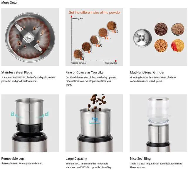| Grinding ingredients | potato,cucumber, coffee bean, dry spices, nuts, grains and so on | coffee bean, dry spices, nuts, grains and so on | coffee bean, dry spices, nuts, grains and so on | coffee bean, dry spices, nuts, grains and so on | coffee bean, dry spices, nuts, grains and so on | coffee bean, dry spices, nuts, grains and so on |