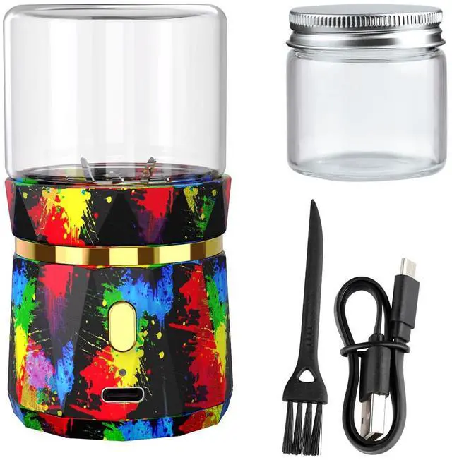 Package Includes 1 * grinder with glass jar, 1 * glass storage jar with sealing cover, 1 * cleaning brush, and 1 * USB charging cable.