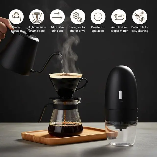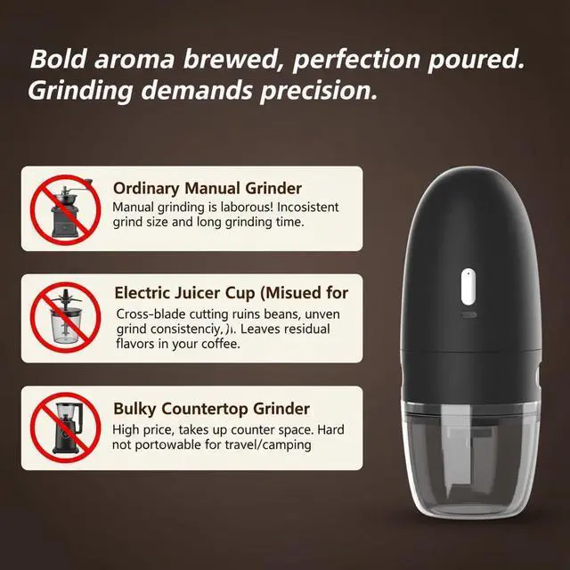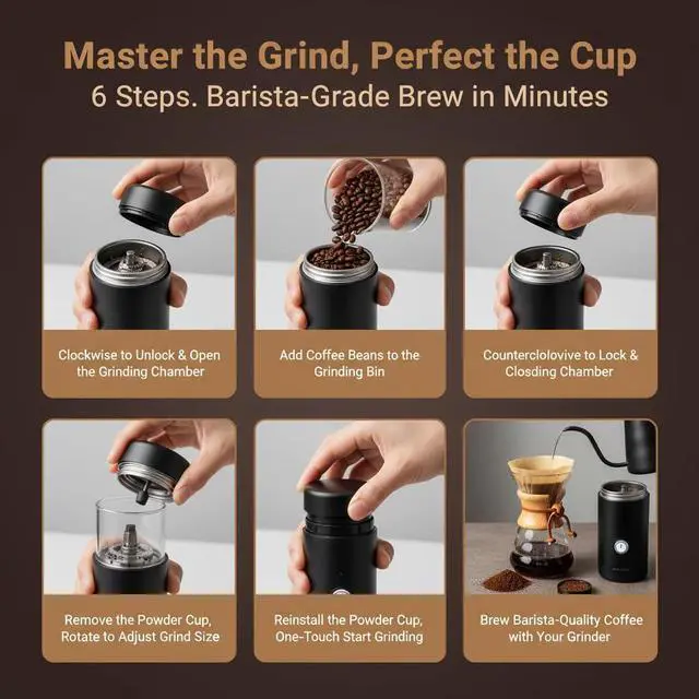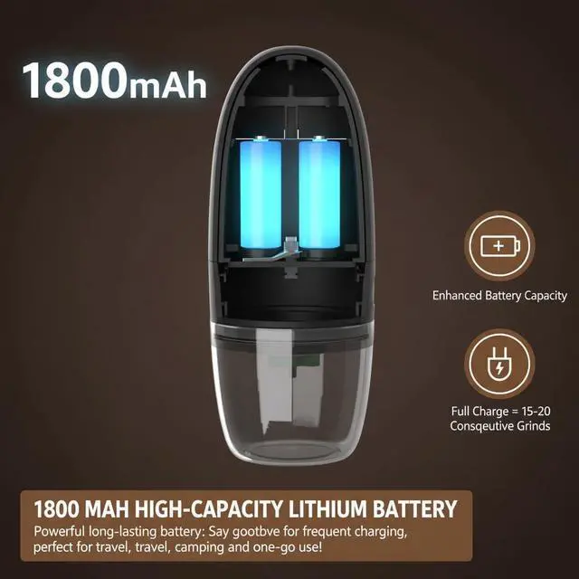 One-Touch Operation with Auto Shut-Off Fresh grounds in seconds! Simply load the beans, press the button, and let the grinder do the workit stops automatically when done. Grind up to 15g of coffee in under two minutes, perfect for single servings or on-the-go brewing. No guessing, no mess: just fast, simple, and hassle-free.