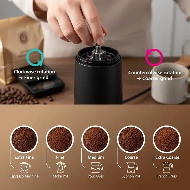 Coffee Grinder, Conical Burr, Adjustable Grind Settings | Portable USB-C Rechargeable, for Espresso, French Press, Cold Brew, Travel & Home, Black