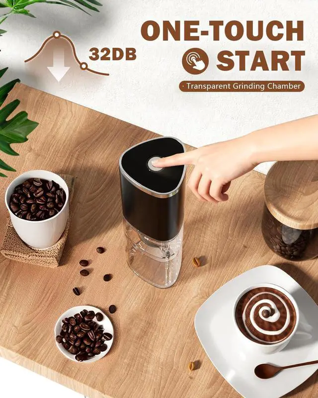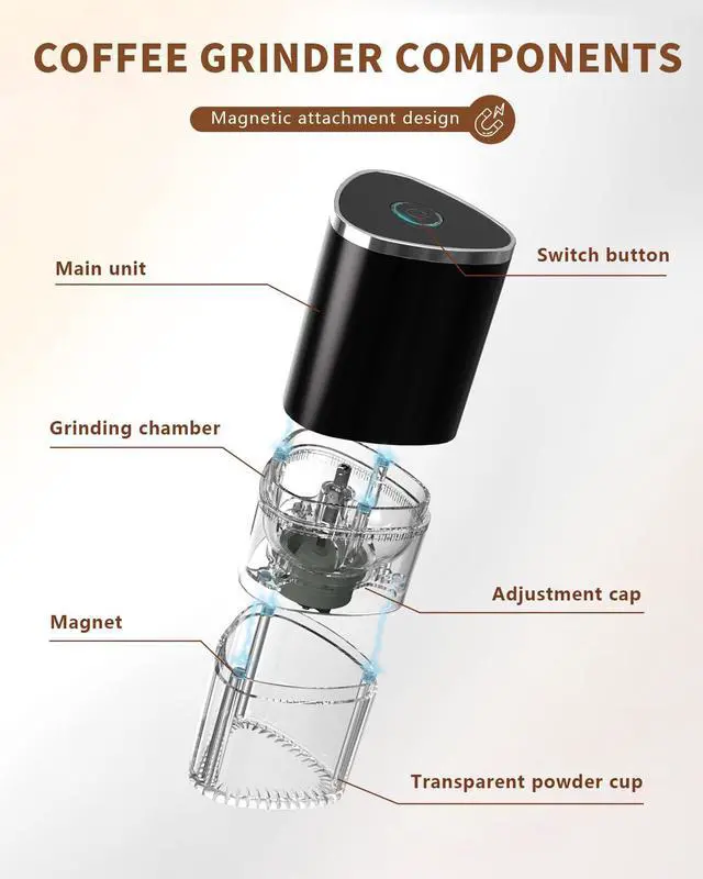 Note: If beans get stuck, open the bean hopper for cleaning before use. Before first use, ensure the machine is charged. If the machine stops mid-use due to low battery, try recharging it before resuming operation. The grinding speed is relatively slow, so please be patient and wait a little longer!