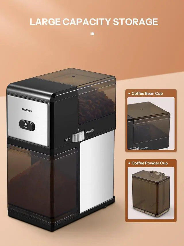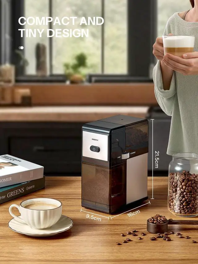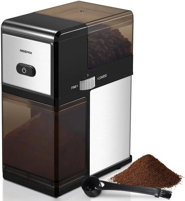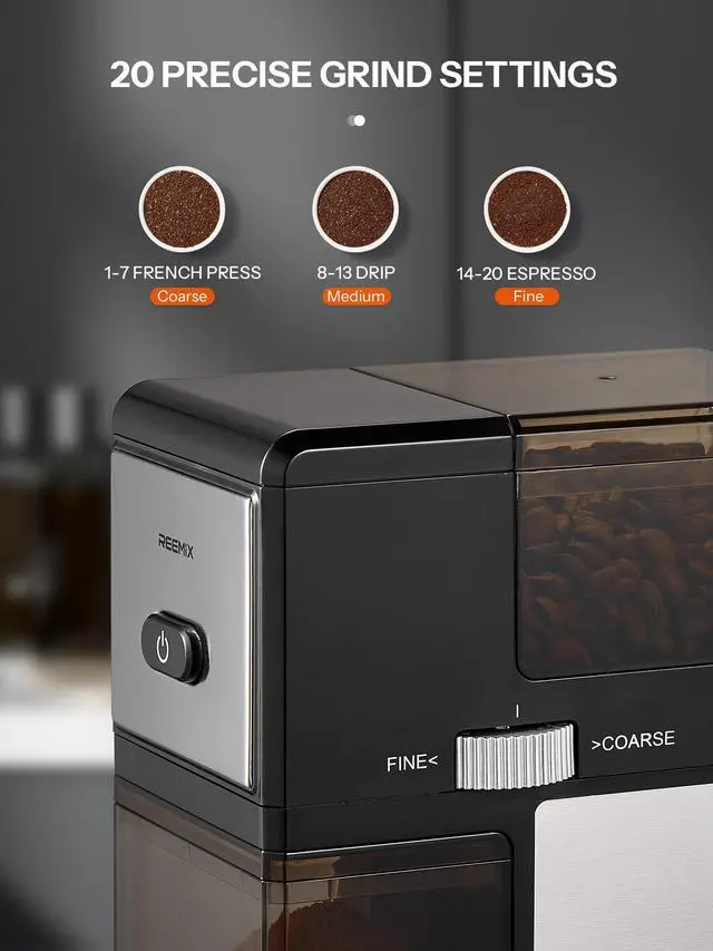 Electric Burr Coffee Grinder, Reemix Automatic Flat Burr Coffee for French Press, Drip Coffee and Espresso, Adjustable Burr Mill, Black+Silver