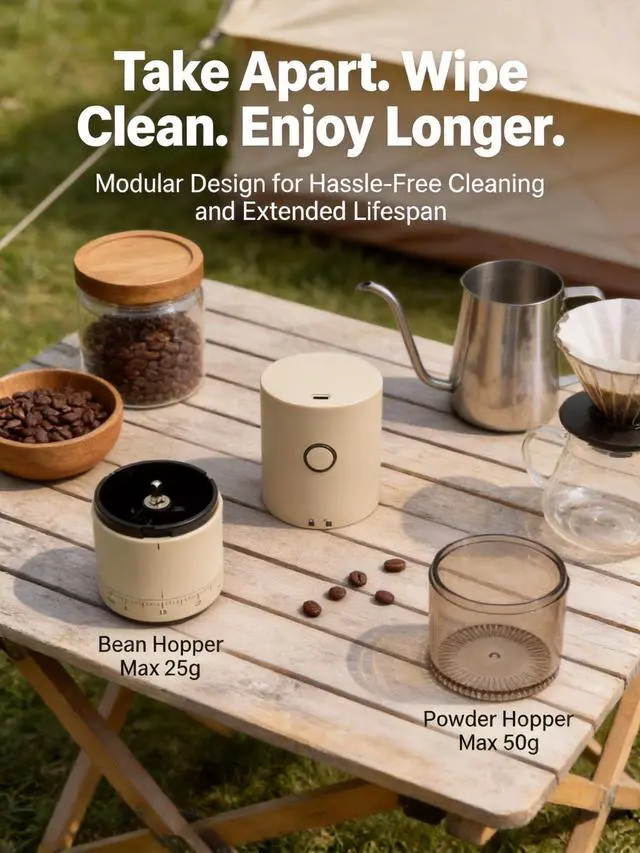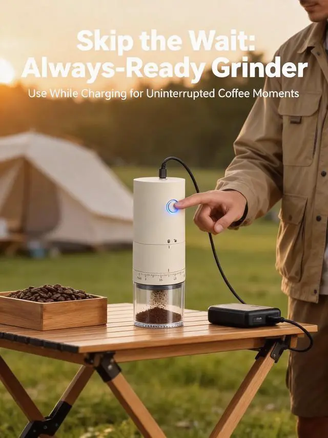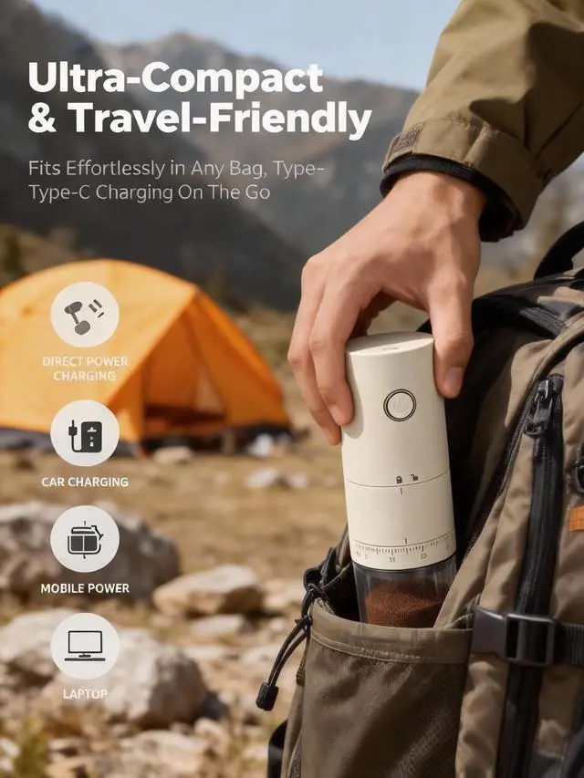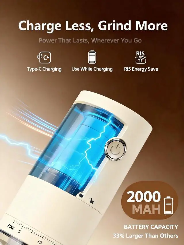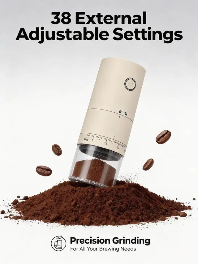 Experience the perfect grind with the LAMIDO Electric Coffee Grinder, designed for coffee lovers who value precision and convenience. Featuring a 38-gear external adjustment ring, it allows effortless control over grind coarseness for espresso, cold brew, pour-over, and French press, delivering exceptional flavor every time. Its compact, cordless design (2.68 x 2.68 x 7.68 inches) is perfect for travel, camping, or business trips, while the rechargeable 2000mAh battery powers up to 25 grinding sessions on a single charge. With a versatile Type-C charging port, you can easily connect to laptops, power banks, or car chargers for on-the-go convenience. The high-hardness ceramic conical burrs ensure uniform grounds, preserving the natural aroma and flavor of your coffee beans by minimizing heat generation. Cleaning is simple with its detachable designuse the included brush for residual powder or rinse the grinding chamber and tank with water (main unit not washable). Whether at home or on the move, the LAMIDO Electric Coffee Grinder is the ultimate companion for fresh, flavorful coffee anytime, anywhere.