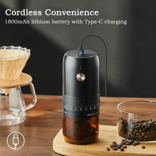 [Cordless Convenience] No more tangled cords! Our cordless coffee grinder uses a rechargeable 1800mAh lithium battery with Type-C charging. Ideal for travelers and enthusiasts, it grinds at least 300g on one charge.