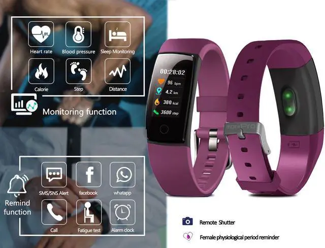 Color Screen: 0.96 -inch Color Screen Using 0.96 -inch IPS color technology, an alternative to the TFT color screen. High definition, bright colored display. Update the previous black and white, wake-up gesture setting. Let the bracelet be no longer monotonous, health and fashion coexist. DYNAMIC HEART RATE and AUTO SLEEP MONITOR: More Pro Mix fitness tracker monitors dynamic heart rate, uploading the real-time data of heartbeats to the phone app. Also, support automatic sleep monitoring, it records deep sleep, light sleep, awake time and whole sleep time. All health data show in a chart, clearly acknowledge your physical fitness status of the whole day. Main Functions: Female physiological period reminder, count-down, Step count, 24-hour continuous blood pressure monitoring, 24-hour continuous heart rate monitoring, Stopwatch, Reminder, Running mode, Multi-display mode, Fatigue test, Calorie, mileage, Call reminder, Refuse call, Wechat movement, Notification, Sleep Monitoring, Photograph, Waterproof, Phone tracking, Heart rate warning, Sedentary Reminder. Built-in USB Plug: Built-in USB plug makes it easy to charge with any USB block and computer; no charging cable and dock needed; one single charge gives you up to 7 days of working time ( Note: battery lasts 3-5 days by heavy loading; Battery lasts 5-7 days by light loading ) COMPATIBILITY: The app supports most smartphones with Bluetooth 4.0. Support system: iOS 8.0 or above (iPhone 4S, iPhone 5/5S/5C, iPhone 6/6Splus, iPhone 7/7S plus, iPhone8 iPhones, etc. ), Android 4.4 or above (Huawei Mate7/P9, LG, Samsung, etc ). If for any reason you are not satisfied, please do not hesitate to contact us. Introducing the MorePro Waterproof Health Tracker with Heart Rate, Blood Pressure, Calories, Pedometer, Sleep Monitor, Call/SMS Remind for Smartphones. This innovative activity tracker by morePro is designed to elevate your health and fitness tracking experience. With a sleek purple color and a regular fit, this device seamlessly integrates into your daily routine.