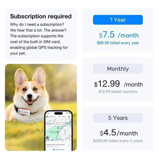Subscription Plan Needed: The Subscription provides monthly, 1 year package, 5 years package, starting from $4.5 /month (varies depending on subscription plan). No other hidden costs. The dog tracker works for Apple IOS products and Android