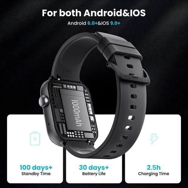 1000 mAh Long Battery Life: This android smart watch is built-in 1000 mAh battery large battery that can last 30 days on a 2.5 hoursmart charge and 100 days of standby time. No need to recharge frequently to meet your daily use.