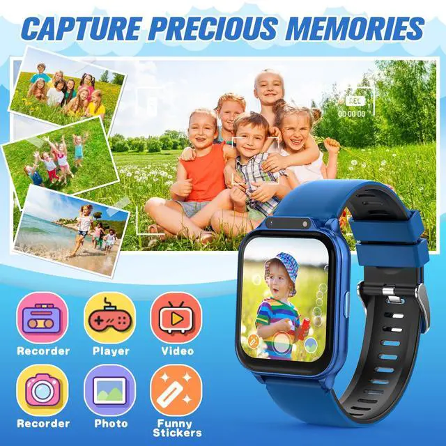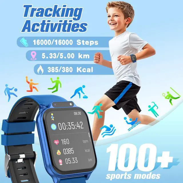 MUTI-FUNCTIONAL KIDS SMART WATCH - Sleep Monitor, Heart Rate, Blood Oxygen, Stress, 22/100+ Sport Modes, DIY Dial, Rewards, Games, Storybook, Camera, Alarm Clock (Set 10+), Stopwatch, Calculator, Timer, Calendar, Audiobooks, Learning Cards, 20 Languages(English, Español, Português, , etc), Music, Torch, Player, Volume, Bluetooth Phone, Sedentary Reminder, Recorder and more.