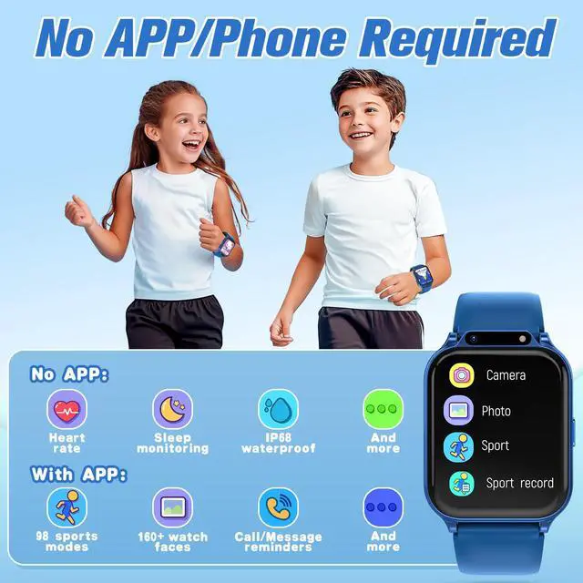 Smart Watch for Kids 1.85" with Fitness Tracker, Sleep Monitor, 22/100+ Sport Modes, DIY Dial, IP68 Waterproof, Step Counter, Heart Rate, Camera, with/Without APP, Gift for 3-12 Years Old Boys Girls