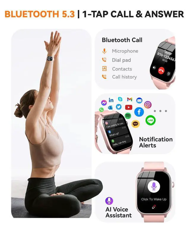 Consistent Bluetooth CallingThis men and women smart watch comes with the latest Bluetooth 5.3 technology, delivering superior call performance, extended wireless range, and minimized power drain. Stay connected via vibration alerts for incoming calls, text messages, and notifications from apps including Facebook, WhatsApp, and Instagram.