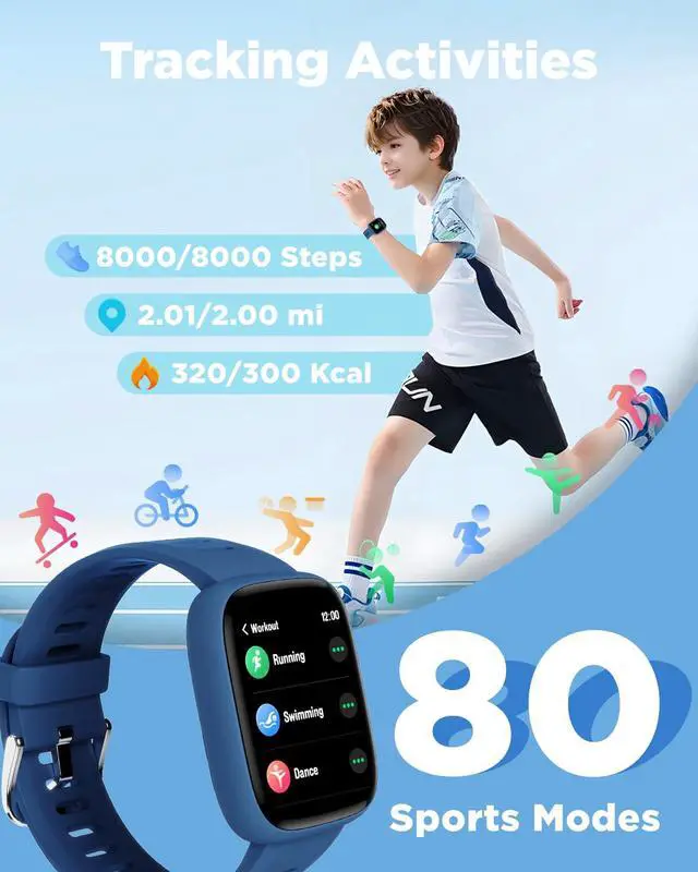 • All-Day Activity Tracking: BIGGERFIVE BRAVE 2 Smart Watch for Kids Teens Automatically counts steps, distance, calories burned, and active minutes. Supports 80 sports modes like walking, running, cycling, basketball, and more.