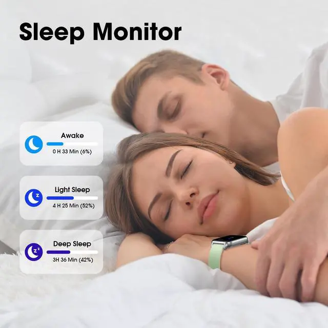 24/7 Heart Rate Monitor and Sleep Tracker MonitorOur smart watch monitors your heart rate in real time, and you can use the watch to manually detect your Heat Rate,SpO2 and Stress. This smart watch trackers your relevant sleep data after you fall asleep, assisting you in cultivating a healthier lifestyle.
