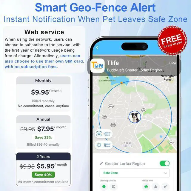 REAL-TIME GPS TRACKING & 1-YEAR FREE SUBSCRIPTION: Powered by 5 global satellite systems and 4G/Wi-Fi technology, this tracker pinpoints your dog's location with 5-8 meter accuracy. Best of all, enjoy a complimentary 1-year premium subscription right out of the box! Unlock all advanced features with zero hidden fees for the first 12 months, giving you uninterrupted peace of mind.