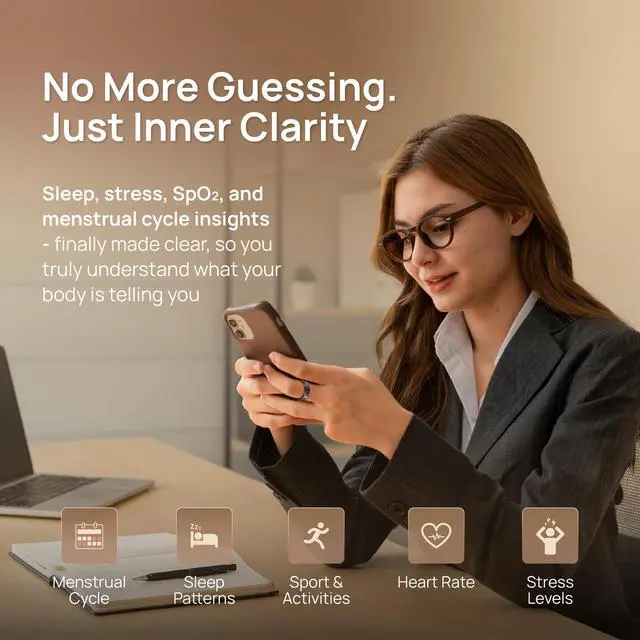 • 24/7 Comprehensive Health Tracking in One Ring: Stay on top of your well-being by continuously tracking heart rate, blood oxygen, sleep stages, stress, steps, calories and menstrual data - all from your finger. With 170+ sport modes and real-time insights, Pachira helps you stay balanced, active, and in control of your fitness goals.
