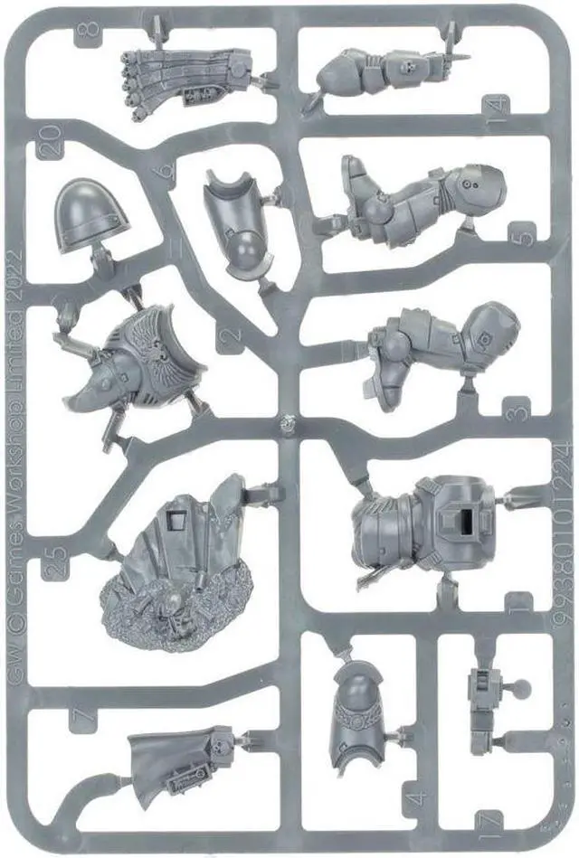 This multipart plastic kit builds one Space Marine Lieutenant, a trusted officer of his Chapter's ranks. He comes with multiple weapon options his left hand grips a heavy bolt pistol, a plasma pistol, or a master-crafted bolt weapon for shooting at a distance, while his right arm can wield a power sword, a power fist, or gesture toward a tactical goal.