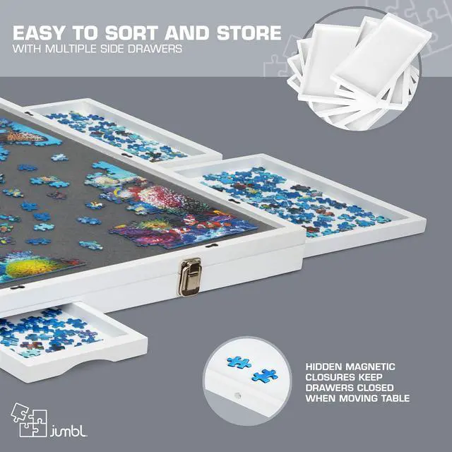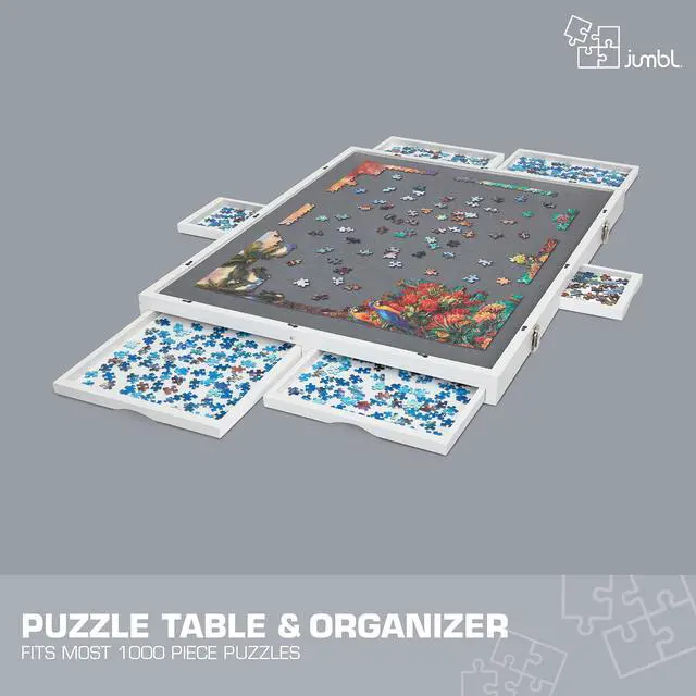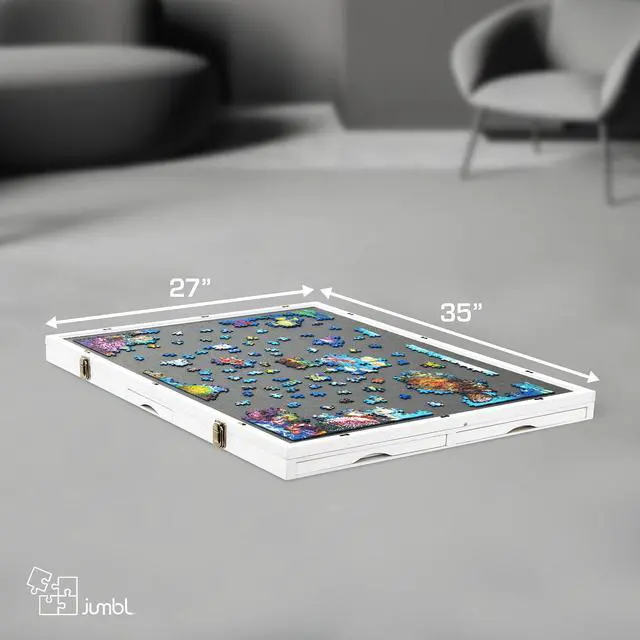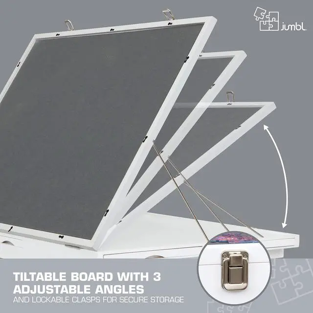 Experience your favorite pastime like never before with this portable Puzzle Board from Jumbl! Puzzle enthusiasts finally have a place to organize, store, carry, and complete their creations without worrying about missing pieces or lost progress. Built like a slim briefcase, the wooden board’s ample workspace features a soft-gripped surface, non-slip felt feet, magnetic drawers, and other features designed for optimal security and ease of play. An edged border keeps puzzle and game pieces safely contained, while the removable compartments are perfect for sorting puzzle pieces and storing playing cards, chips, tokens, dice, and other gaming supplies. When you’re not puzzling, preserve your work-in-progress with the protective felt cover and stow under a sofa for next time. Gamers also love our system’s unique tilt feature, which allows you to angle the play area for more comfortable viewing and better accessibility. It really is a puzzler’s dream—and the possibilities are endless! Add a Jumbl Puzzle Board to your cart today!