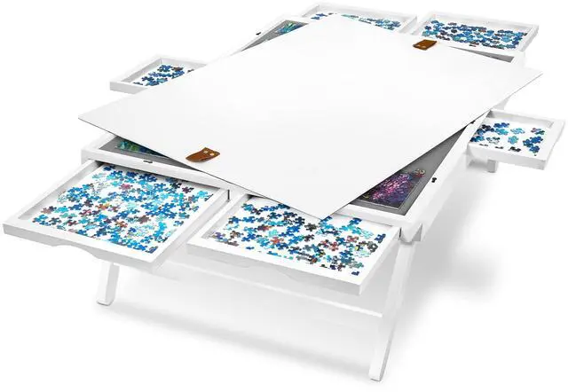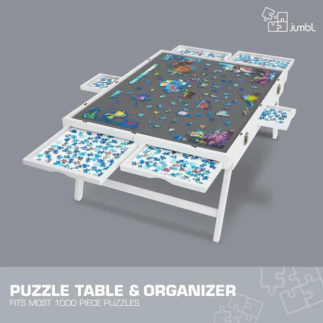 Experience your favorite pastime like never before with this portable Puzzle Board from Jumbl! Puzzle enthusiasts finally have a place to organize, store, carry, and complete their creations without worrying about missing pieces or lost progress. Built like a classic tray table, the wooden board’s ample workspace features a soft-gripped surface, magnetic drawers, non-slip folding legs, and other features designed for optimal security and ease of play. An edged border keeps puzzle and game pieces safely contained, while the removable compartments are perfect for sorting puzzle pieces and storing playing cards, chips, tokens, dice, and other gaming supplies. When you’re not puzzling, preserve your work-in-progress with the protective felt cover and stow under a sofa for next time. It really is a puzzler’s dream—and the possibilities are endless! Add a Jumbl Puzzle Board to your cart today!
