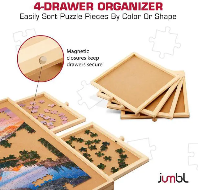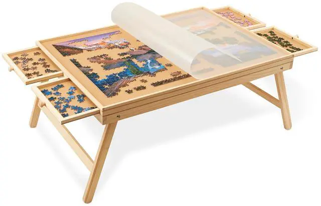 Built to last, this board is crafted from sturdy natural wood that resists wear and tear, providing years of dependable use. The spacious drawers let you sort and store puzzle pieces with ease, while the foldable legs lets you to choose between a freestanding table setup or a flat position. When its time to take a break, the included protective mat cover keeps your progress safe & secure. The slim & lightweight design allows you to easily fold up the legs & slide it under any safe spot until youre ready to return.