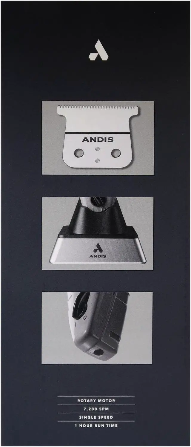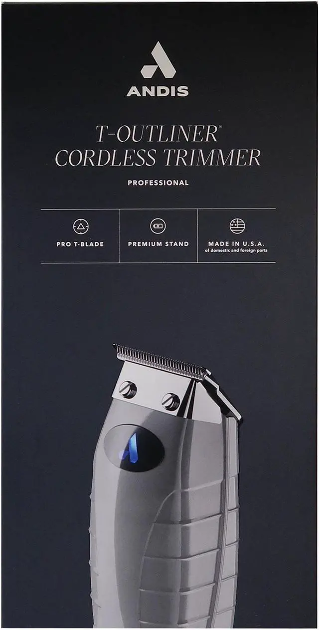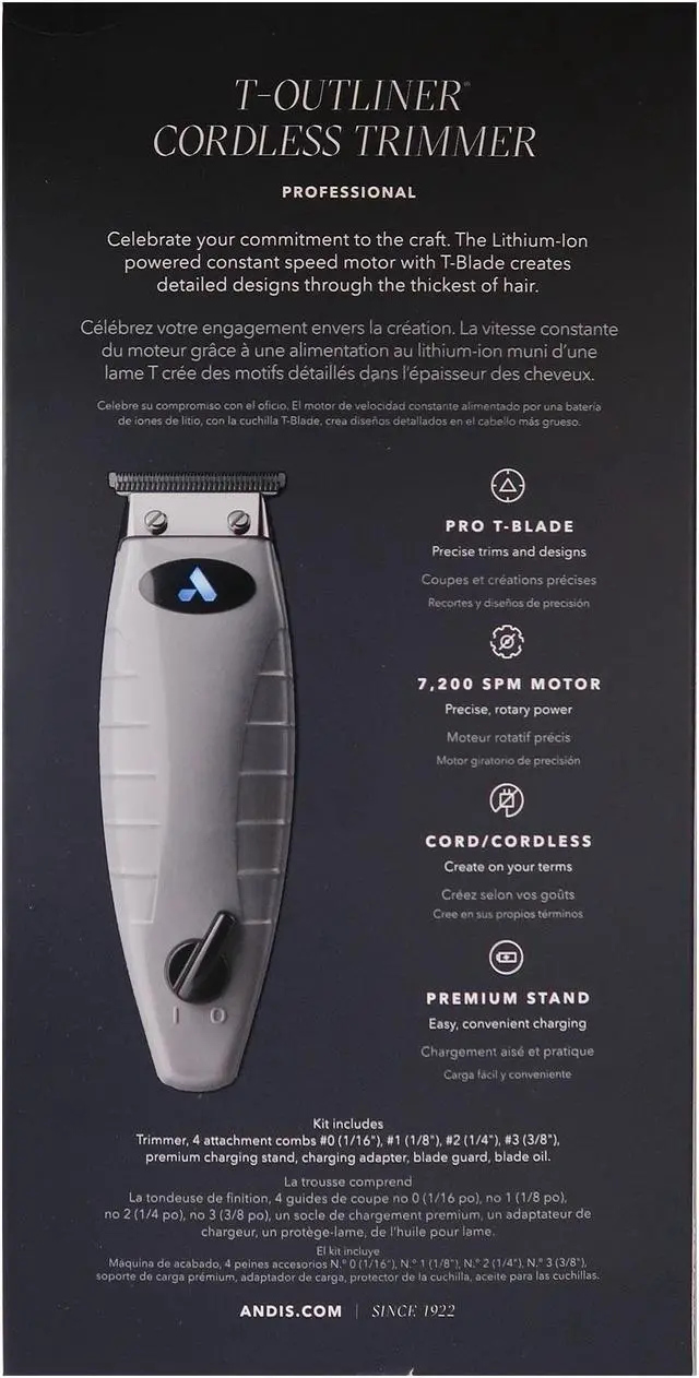 Andis Cordless T-Outliner Li Trimmer #74055Creative empires are built on foundations of basic technique. Conquer the fundamentals with the upgraded Cordless T-Outliner Trimmer, everything you love about the classic Andis T-Out, fully unleashed. Driven forward by a carefully designed, 7,200 SPM rotary motor, this potent powerhouse glides through heavy and thick hair without dragging or stalling, thanks to constant speed technology. Iconic, carbon-steel T-blade can be zero-gapped for ultra-fine lining, freestyle designs, and dry shaving to the skin. Use with or without the cord or monitor the extra long-lasting lithium-ion battery via a built-in LED indicator that alerts you when its time to recharge on the premium charge stand. Complete with 4 easy-in attachment combs, blade oil, and a replacement blade drive, this essential kit contains everything you need to keep your tools and skills strong.