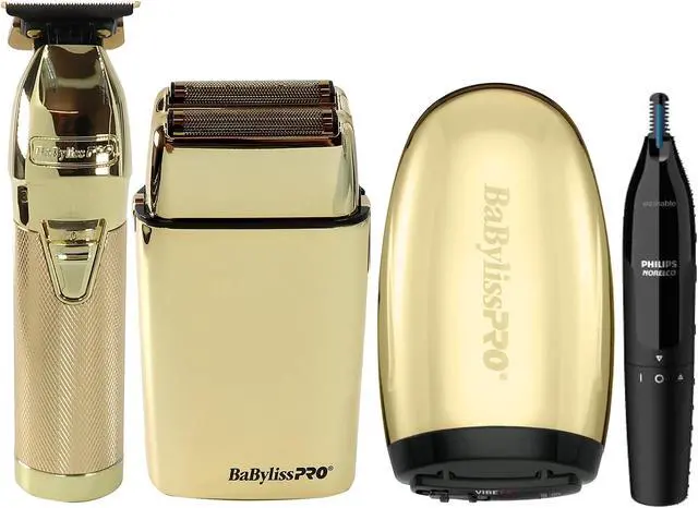 BABYLISS PRO LIMITEDFX COLLECTION TRIMMER AND DOUBLE FOIL SHAVER GOLD #FXDUOFS2TG + BABYLISS PRO VIBE FX CORD / CORDLESS MASSAGER FXSSMG GOLD + PHILIPS NORELCO ULTIMATE COMFORT NOSE TRIMMER 1000 BATTERY POWERED NT1605/60 FOR NOSE, EAR AND EYEBROWS BaByliss Pro LIMITEDFX Collection Gold Trimmer and Double Foil Shaver #FXDUOFS2TG Trimmer: - Gold DLC/Titanium Standard-Tooth T-Blade (FX707Z): Zero-Gap Adjustable