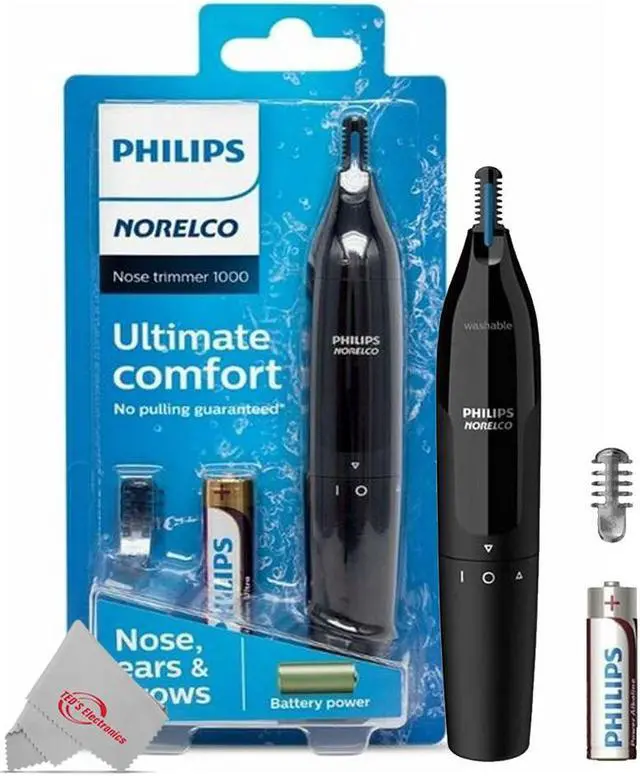 Philips Norelco Ultimate Comfort Nose Trimmer 1000 Battery Powered NT1605/60 The Norelco Nose Trimmer 1000 delivers ultimate comfort with no pulling guaranteed! Trims unwanted nose, ear, and eyebrow hair with ease. Includes a linear trimmer, AA battery, and eyebrow guard. Fully washable and easy to clean.
