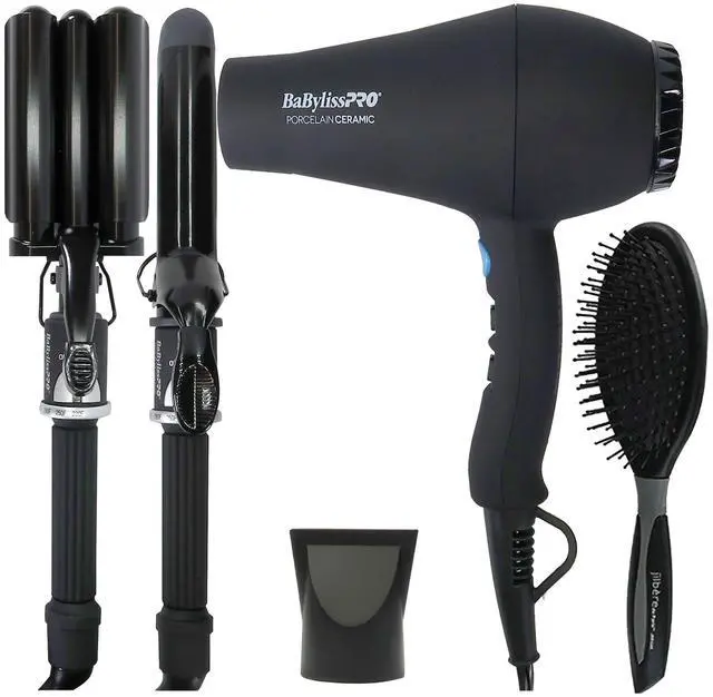 BABYLISS PRO LIMITED EDITION PORCELAIN CERAMIC STYLING SET (PROFESSIONAL IONIC DRYER, TRIPLE BARREL WAVER, 1¼" SPRING CURLING IRON) #BPPP7-24 + CONAIR PRO ERGO-GRIP DETANGLER BRUSH FOR ALL HAIR TYPESBaByliss Pro LIMITED EDITION Porcelain Ceramic Holiday Prepack #BPPP7-24This exclusive set includes the Carrera2 Dryer, which combines ionic and porcelain ceramic technology to deliver 1900 watts of gentle, infrared heat that protects hair from damage while locking in moisture. With six heat and speed settings, plus a cold shot button and concentrator nozzle, this dryer provides precise styling control. The triple barrel waver in this set features three-barrel sizes 1", ¾", and 1" perfect for creating effortless, natural-looking waves, while heat settings up to 430°F ensure effectiveness on all hair types. Rounding out the set, the 1¼spring curling iron uses porcelain ceramic barrel technology to evenly distribute heat, helping to create smooth, shiny curls that last.