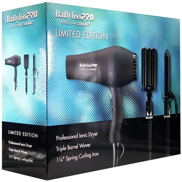 This Bundle from Teds Electronics includes:- BaByliss Pro LIMITED EDITION Porcelain Ceramic Styling Set (Professional Ionic Dryer, Triple Barrel Waver, 1¼" Spring Curling Iron) #BPPP7-24