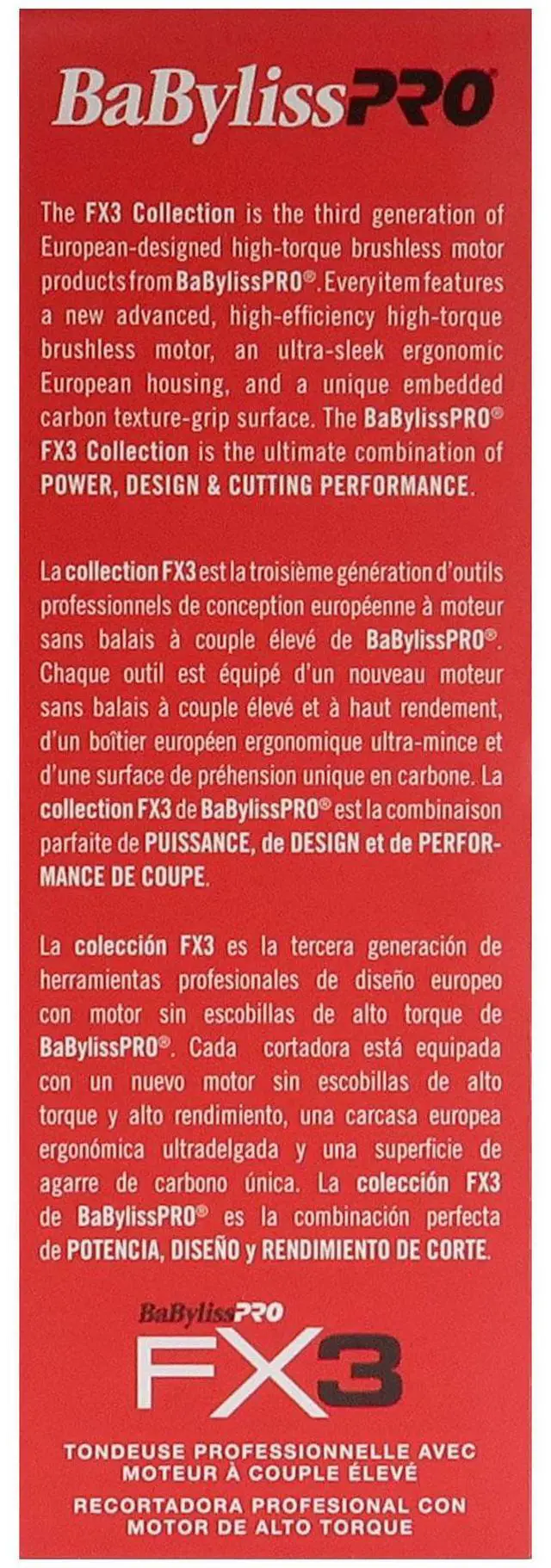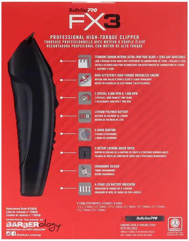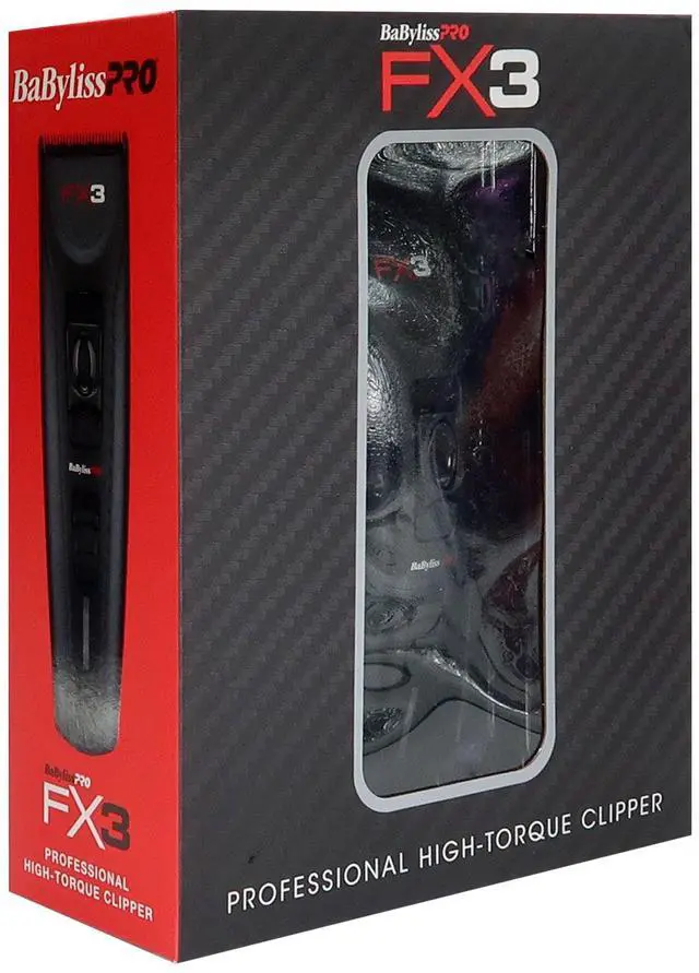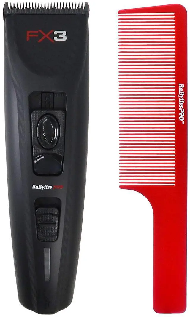 BABYLISS PRO FX3 BLACK HIGH TORQUE CORDLESS CLIPPER FXX3CB (BLACK) + BABYLISSPRO BARBEROLOGY 9 INCH CLIPPER COMB - REDBaByliss PRO FX3 Black High Torque Cordless ClipperThe FX3 Collection. Every item features advanced high-torque engines, ultra-sleek ergonomic European housings, and a unique embedded carbon texture grip surface. The BaByliss Pro FX3 Collection is the ultimate combination of POWER, DESIGN & CUTTING PERFORMANCE.
