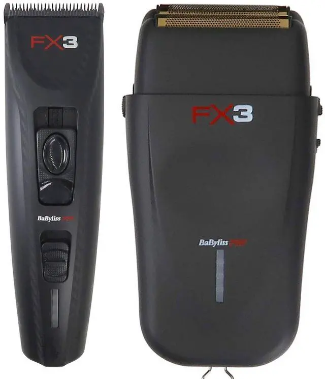 BABYLISS PRO FX3 BLACK HIGH TORQUE CORDLESS CLIPPER FXX3CB (BLACK) + BABYLISS PRO FX3 PROFESSIONAL HIGH-SPEED FOIL SHAVER - BLACK #FXX3SB (DUAL VOLTAGE)BaByliss PRO FX3 Black High Torque Cordless ClipperThe FX3 Collection. Every item features advanced high-torque engines, ultra-sleek ergonomic European housings, and a unique embedded carbon texture grip surface. The BaByliss Pro FX3 Collection is the ultimate combination of POWER, DESIGN & CUTTING PERFORMANCE.