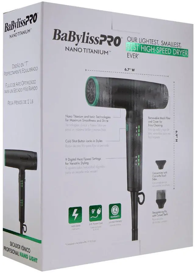 The 1400-watt Nano Titanium Dual Voltage Hair Dryer is a powerful high-speed ionic hair dryer with frizz-reducing styling capabilities and 9 heat/speed settings. NOTE: Unit will not blow hot air if filter is clogged.
