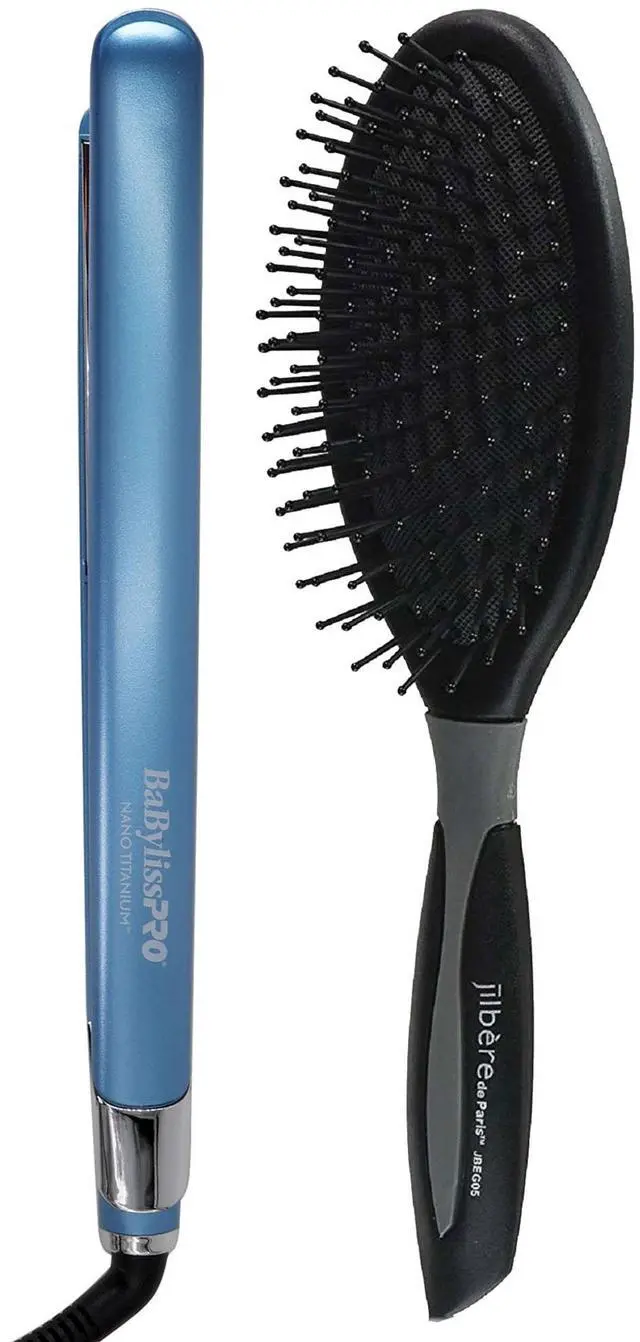 BABYLISS PRO NANO TITANIUM 1" ULTRA-SLEEK HAIR STRAIGHTENER, FLAT IRON + CONAIR PRO ERGO-GRIP DETANGLER BRUSH FOR ALL HAIR TYPESBaByliss Pro Nano Titanium 1" Ultra-Sleek Hair Straightener, Flat IronThe 1" Ultra-Sleek Hair Straightener has ultra smooth and durable titanium plates resulting in shiny hair. The extended-length and full-floating plates make for faster straightening. The ceramic heater has instant heat-up and recovery with temperatures ranging from 265 - 450 degrees. The LED temperature display makes it easy to know your temperature. The slim, ergonomic design allows for comfortable, stress-free styling