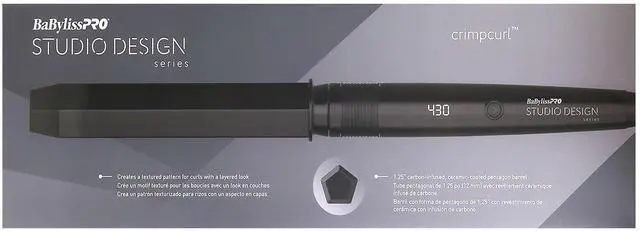 BaByliss Pro Studio Design Series 1.25 Inch Crimp Curl #BCI005UCThe Studio Design Series Crimp curl has a pentagon shaped barrel which creates a textured pattern for curls with a layered look. This tool is perfect for going full glam with a modern Hollywood wave. It has a 1.25" carbon infused, ceramic-coated barrel.