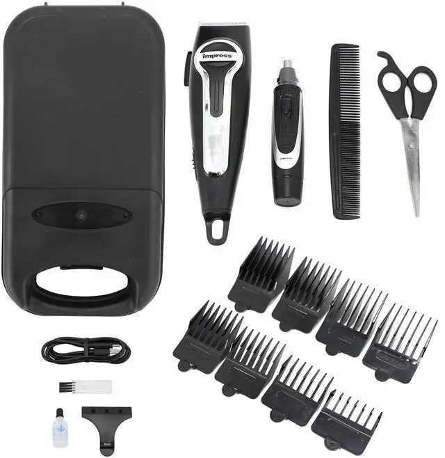 Designed for easy use and maintenance, this set comes with fast USB charging and a USB-C cable, ensuring your clippers are always ready when you need them. The battery-operated nose trimmer includes a cap for safe storage, while the cleaning brush and lubricating oil help maintain the longevity of the clippers and trimmer. All of these accessories are neatly organized in a convenient storage case, keeping everything in one place for easy access. With its compact design and practical features, the Impress 18 Piece Cordless Hair Cutting Kit and Nose Trimmer provides a complete solution for all your grooming needs.